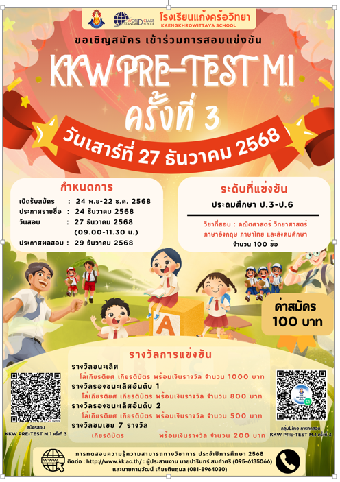 โรงเรียนแก้งคร้อวิทยาขอเชิญชวนน้อง ๆ นักเรียนระดับชั้นประถมศึกษา เข้าร่วมการสอบแข่งขัน KKW Pre-test M.1 ครั้งที่ 3
