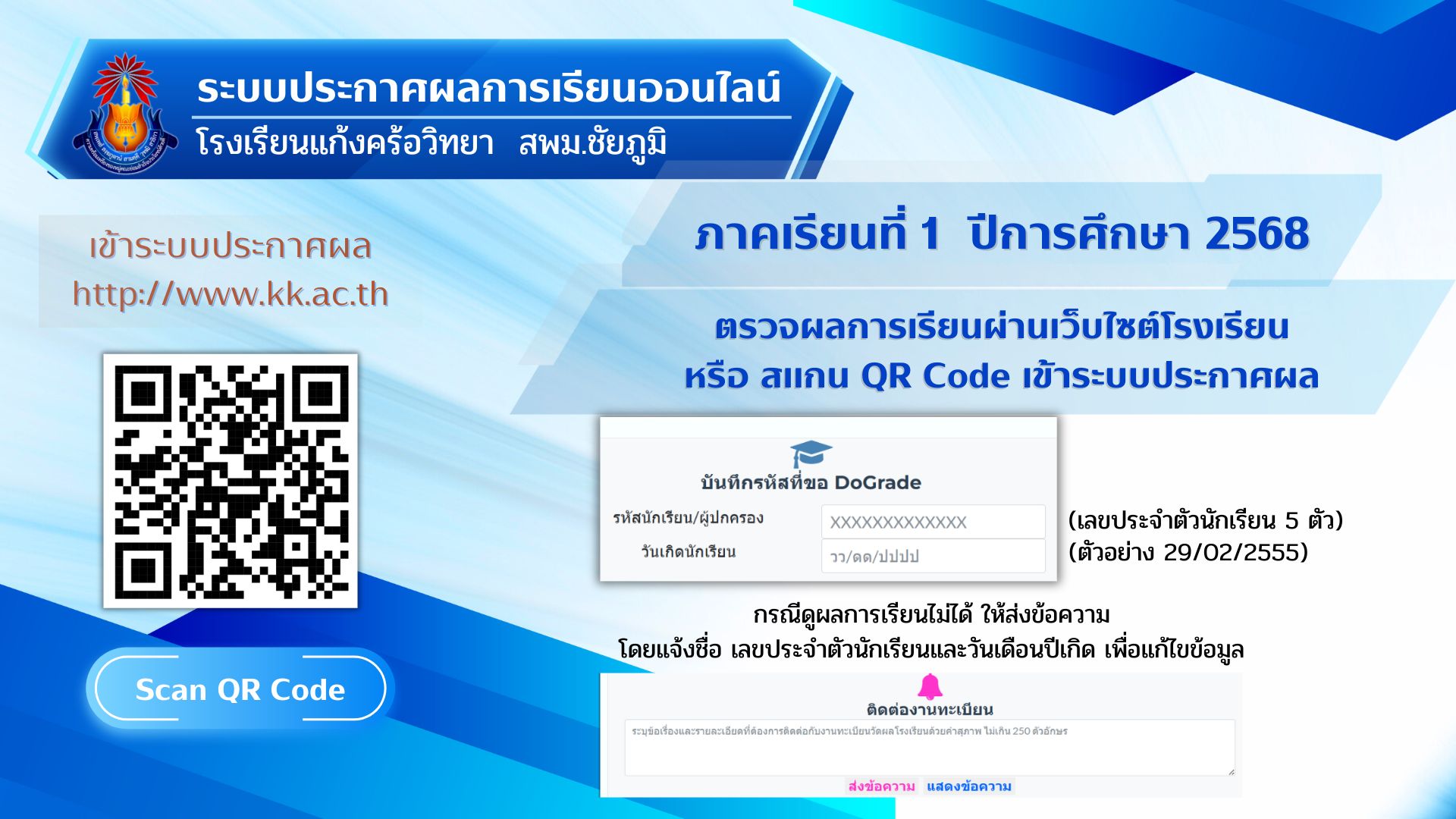 ประกาศผลการเรียน ภาคเรียนที่ 1 ปีการศึกษา 2568 โรงเรียนแก้งคร้อวิทยา ผ่านทางเว็บไซต์โรงเรียน