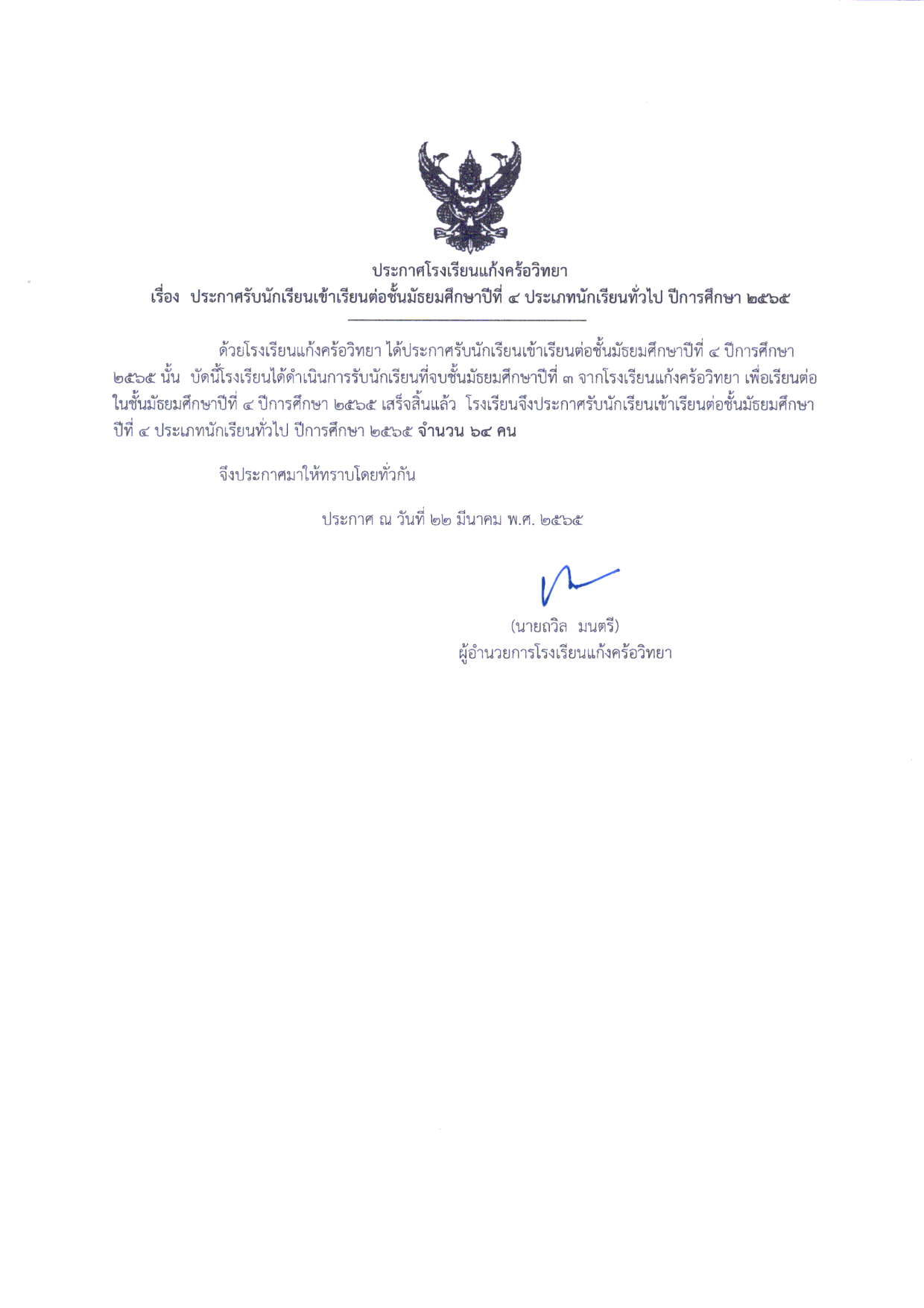 ประกาศรับนักเรียนเข้าเรียนต่อชั้น ม.4 ประเภทนักเรียนทั้วไป ปีการศึกษา 2565