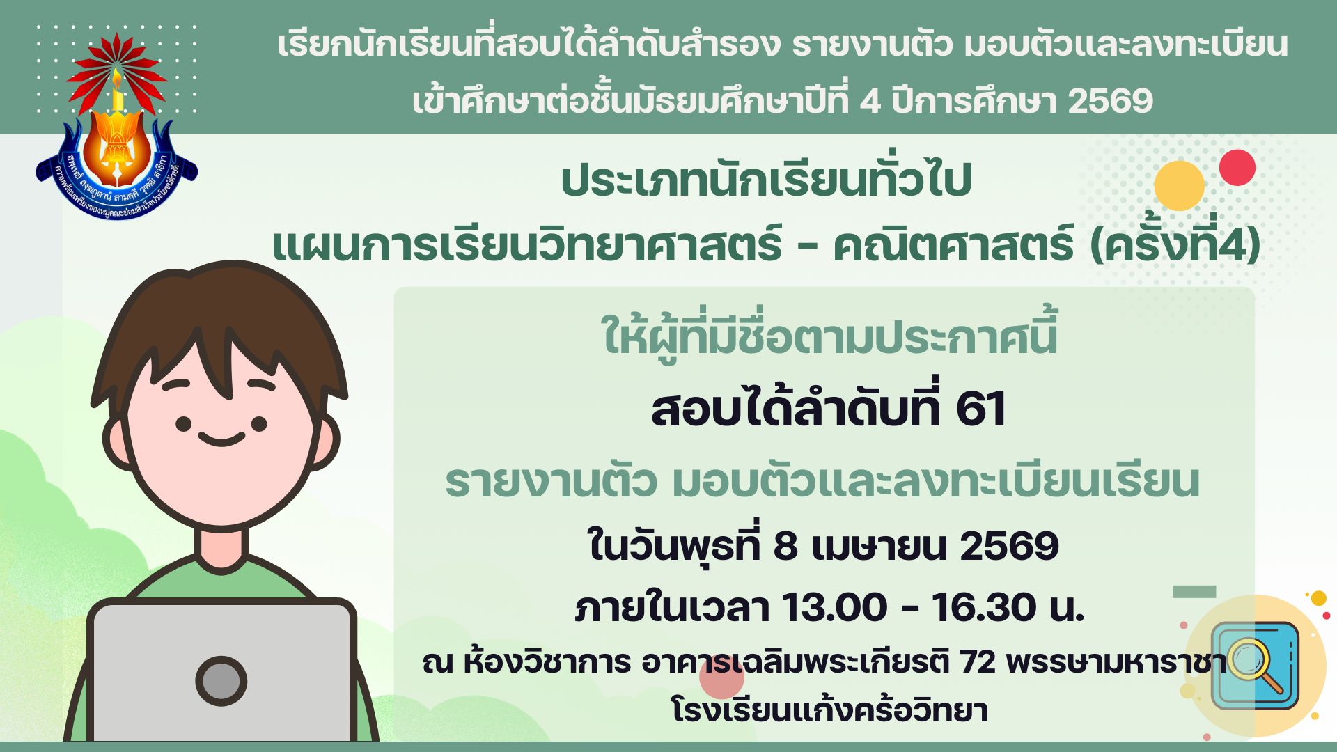 เรียกนักเรียนที่สอบได้ลำดับสำรอง รายงานตัว มอบตัวและลงทะเบียน เข้าศึกษาต่อชั้นมัธยมศึกษาปีที่ 4 ปีการศึกษา 2569 ประเภทนักเรียนทั่วไป แผนการเรียนวิทยาศาสตร์ - คณิตศาสตร์ (ครั้งที่ 4)