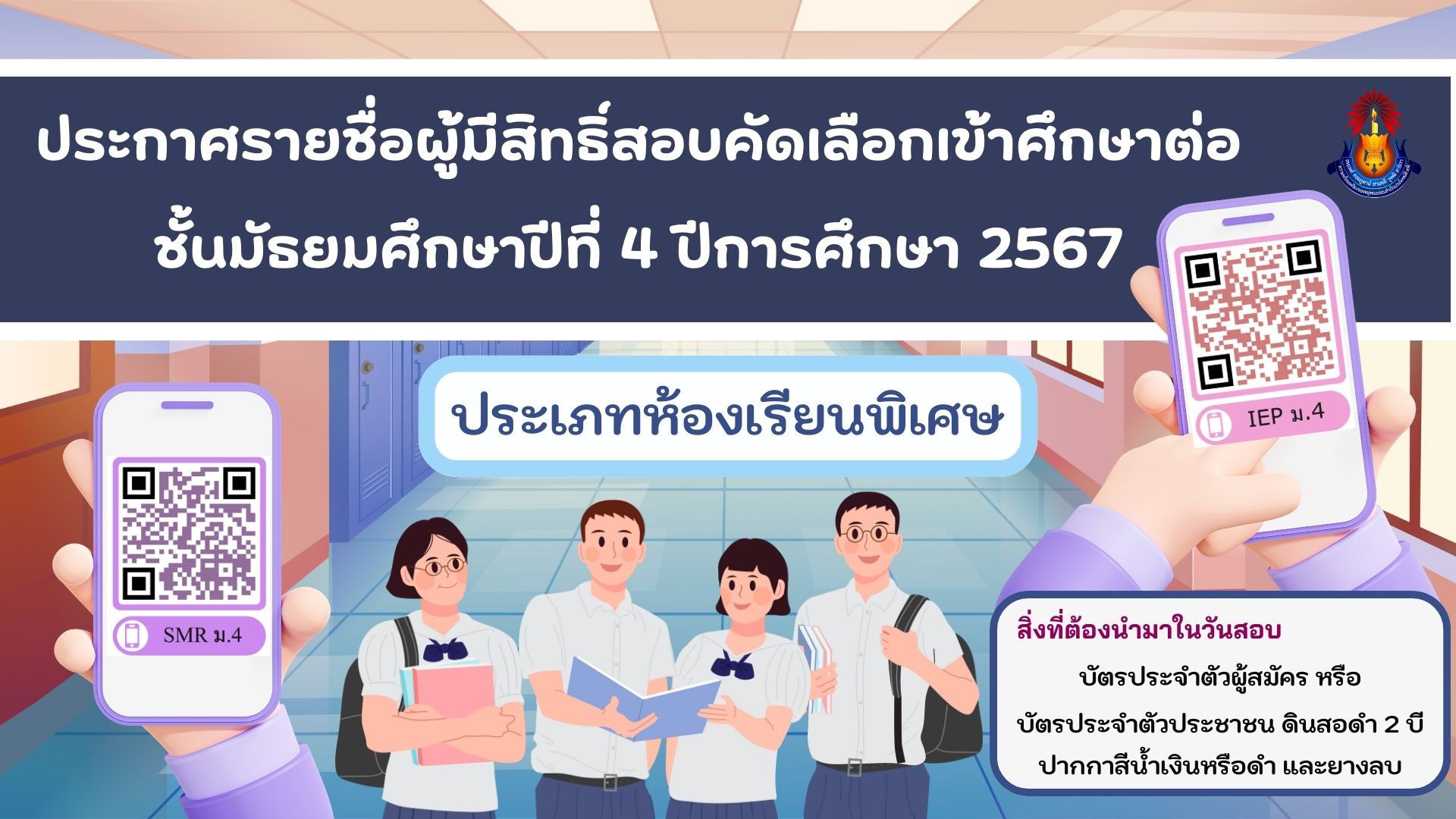 ประกาศรายชื่อผู้มีสิทธิ์สอบคัดเลือกเข้าศึกษาต่อชั้นมัธยมศึกษาปีที่ 4 ปีการศึกษา 2567 ประเภทห้องเรียนพิเศษ