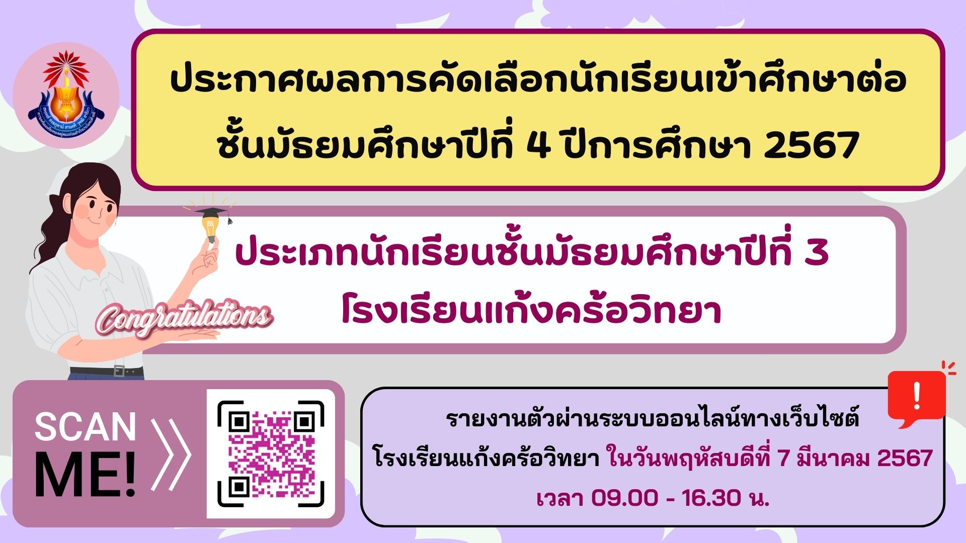 ประกาศผลการคัดเลือกนักเรียนเข้าศึกษาต่อชั้นมัธยมศึกษาปีที่ 4 ปีการศึกษา 2567 ประเภทนักเรียนชั้นมัธยมศึกษาปีที่ 3 โรงเรียนแก้งคร้อวิทยา