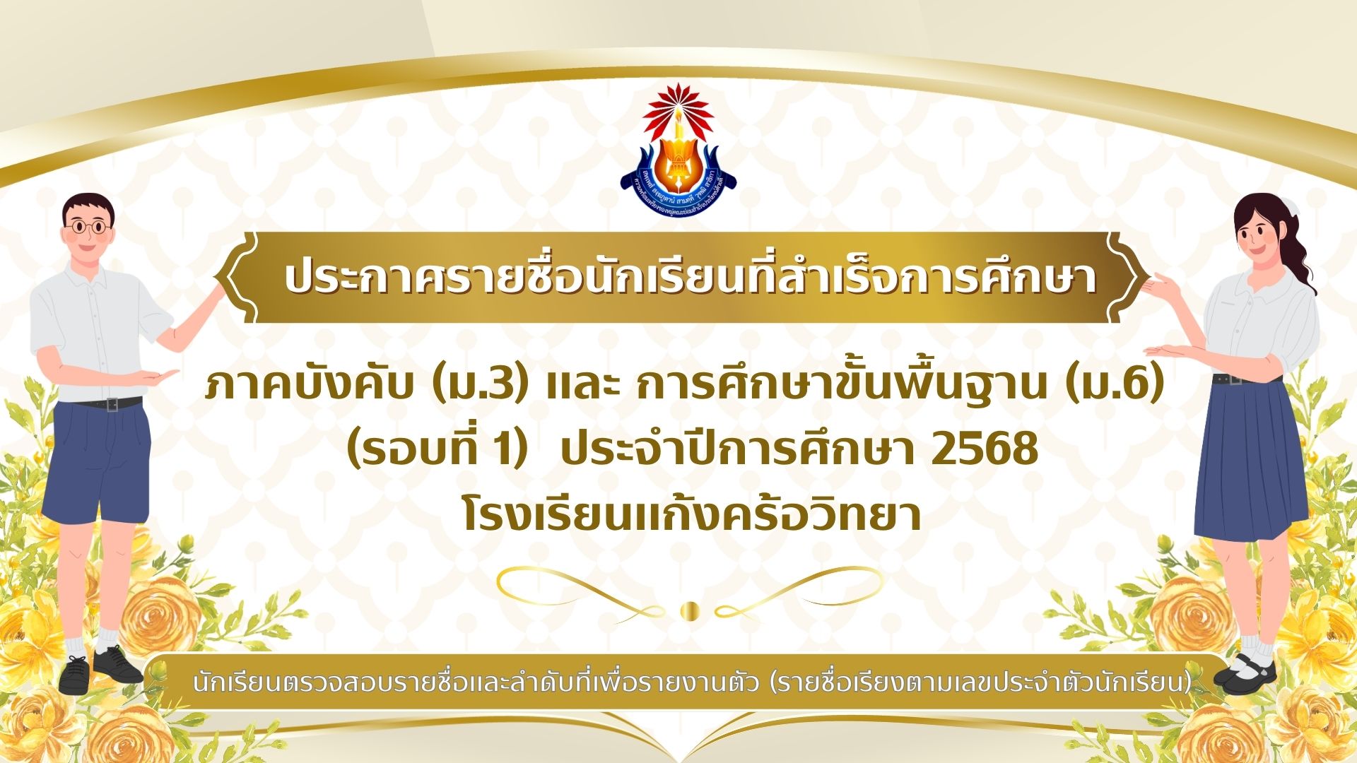 ประกาศรายชื่อผู้สำเร็จการศึกษาภาคบังคับ (ม.3) และการศึกษาขั้นพื้นฐาน (ม.6) ปีการศึกษา 2568 (รอบที่1)