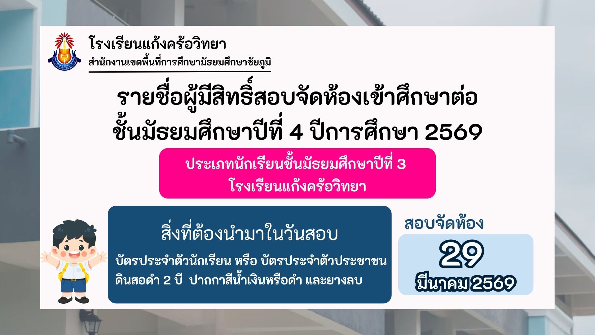 รายชื่อผู้มีสิทธิ์สอบจัดห้องเข้าศึกษาต่อชั้นมัธยมศึกษาปีที่ 4 ปีการศึกษา 2569 ประเภทนักเรียนชั้นมัธยมศึกษาปีที่ 3 โรงเรียนแก้งคร้อวิทยา