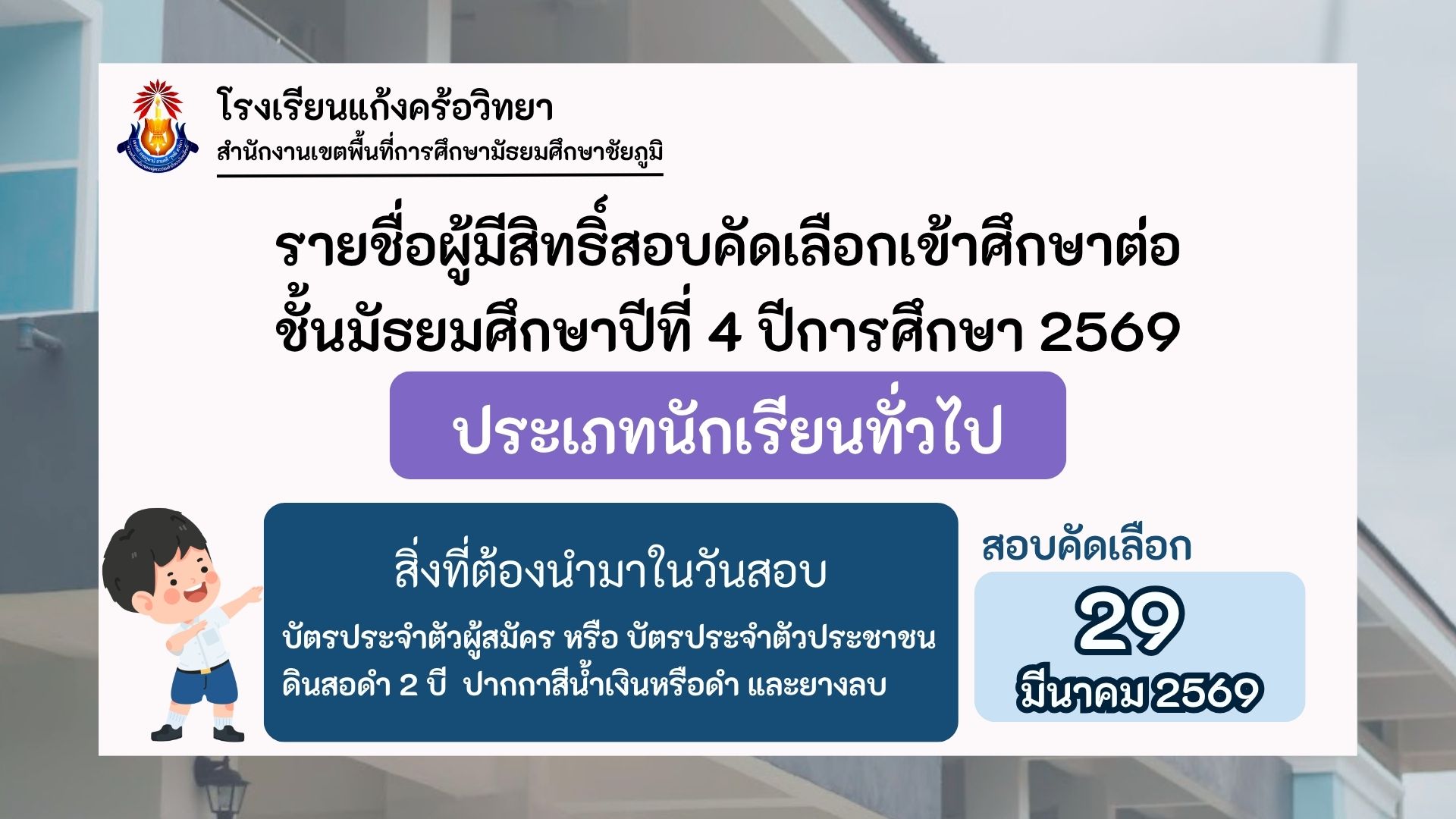 รายชื่อผู้มีสิทธิ์สอบคัดเลือกเข้าศึกษาต่อชั้นมัธยมศึกษาปีที่ 4 ปีการศึกษา 2569 ประเภทนักเรียนทั่วไป