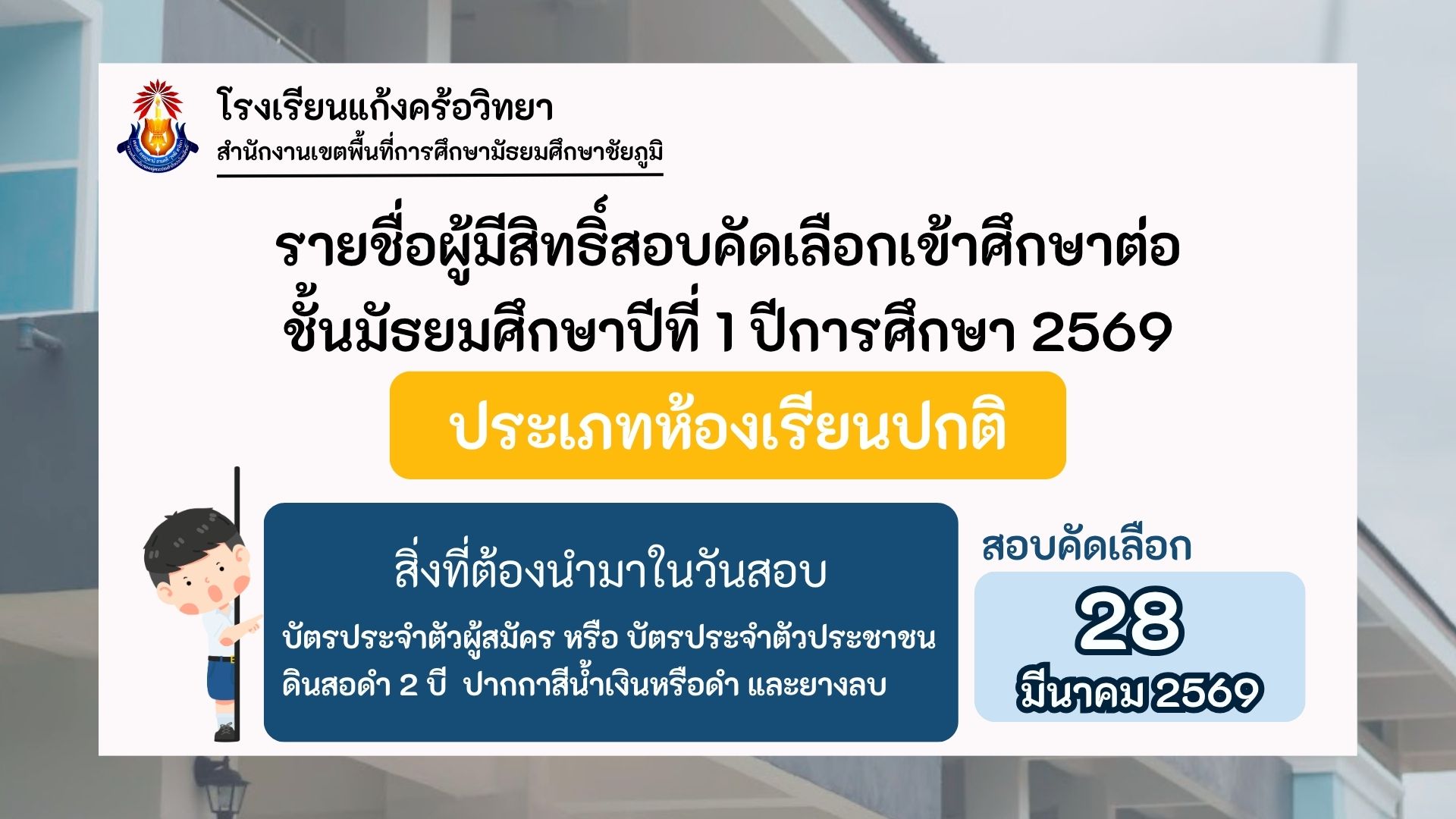 รายชื่อผู้มีสิทธิ์สอบคัดเลือกเข้าศึกษาต่อชั้นมัธยมศึกษาปีที่ 1 ปีการศึกษา 2569 ประเภทห้องเรียนปกติ
