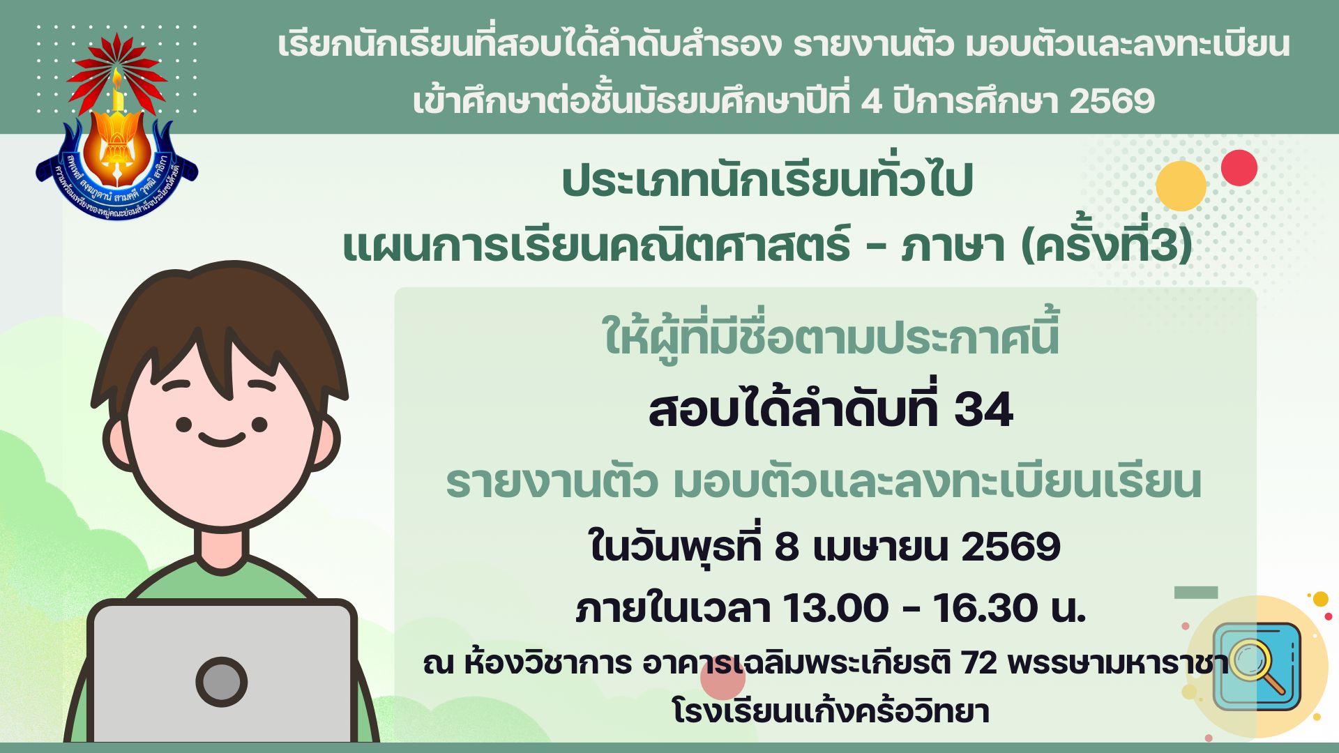 เรียกนักเรียนที่สอบได้ลำดับสำรอง รายงานตัว มอบตัวและลงทะเบียน เข้าศึกษาต่อชั้นมัธยมศึกษาปีที่ 4 ปีการศึกษา 2569 ประเภทนักเรียนทั่วไป แผนการเรียนคณิตศาสตร์ - ภาษา (ครั้งที่3)